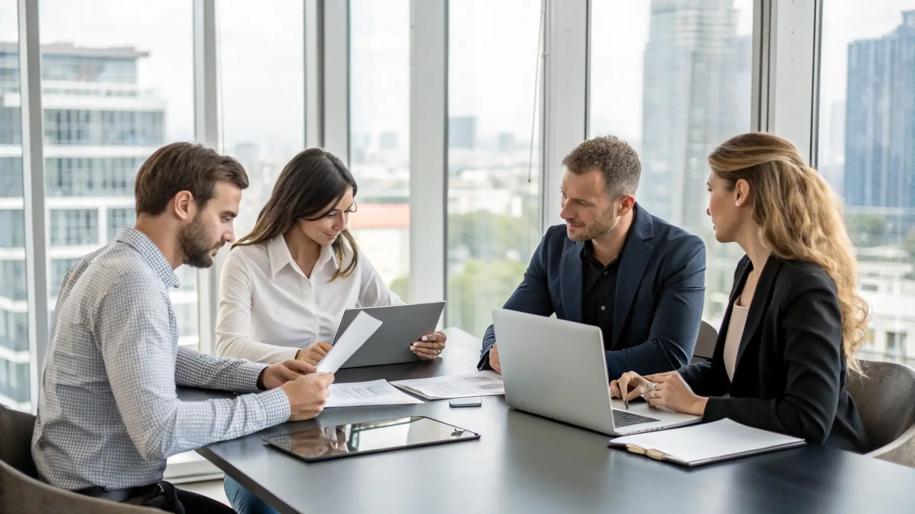 A team of consultants brainstorming growth strategies in a modern office setting, representing NJE Consulting Corp LLC's focus on strategic growth planning.